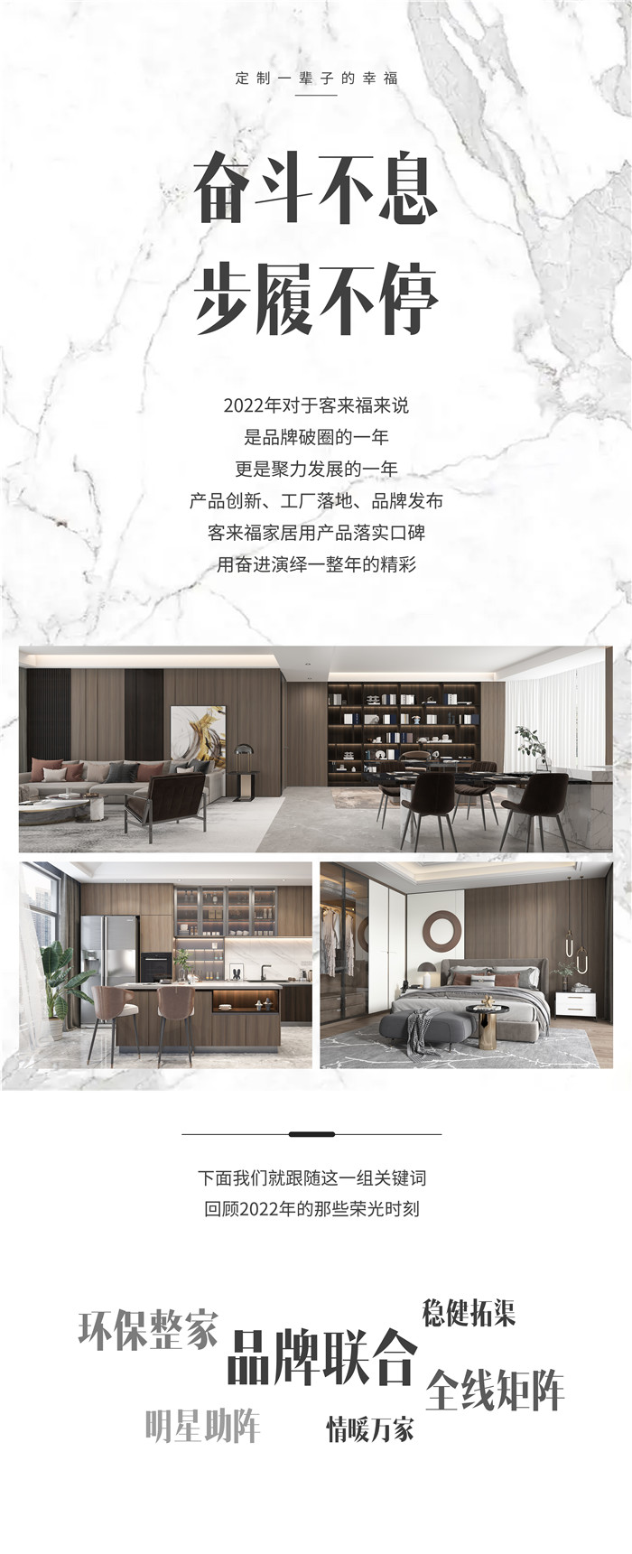 2022年7月8日,客來福家居受邀參加第24屆中國建博會(廣州)展會,并在展會上推出全新產(chǎn)品——天琛系列。2022年9月5日,2022中國建博會(上海)客來福家居攜旗下高定品牌—革物亮相,帶來高端水漆產(chǎn)品KOLON卡倫系列。(查看原文)