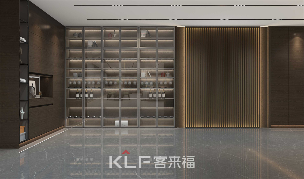 酒柜采用全玻璃門(mén)設(shè)計(jì),加上柜體內(nèi)的燈光,讓整個(gè)酒柜內(nèi)的裝飾一目了然,增強(qiáng)了空間的裝飾感。