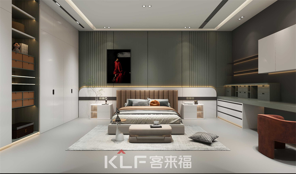 豪嘉系列臥室背景墻采用的是水光綠顏色,床頭背板月牙白顏色,兩邊的衣柜和吊柜柜體采用的是黑木紋柜體,加上月牙白的門(mén)板,讓人一進(jìn)臥室就能感覺(jué)臥室的溫馨和舒適。