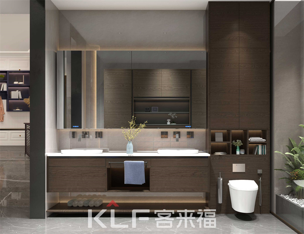 浴室空間,采用橫紋的橡木顏色門(mén)板,與整個(gè)系列的門(mén)板橫紋相呼應(yīng),懸掛的深色浴室柜加上鏡柜的搭配,以淺灰色的瓷磚為輔助,更顯成熟的大人味風(fēng)格。