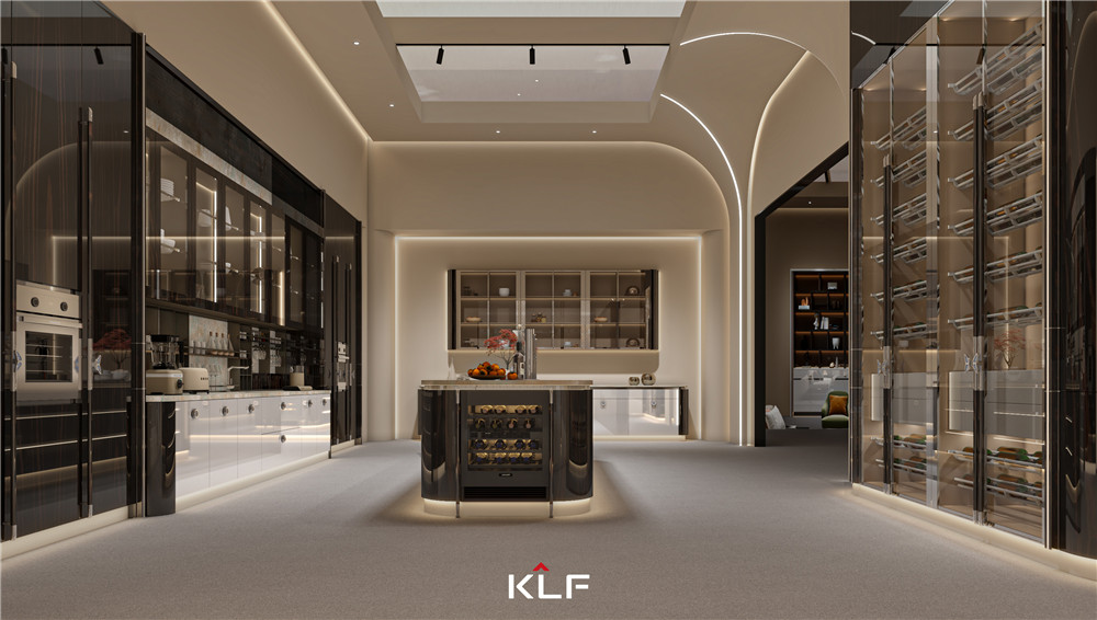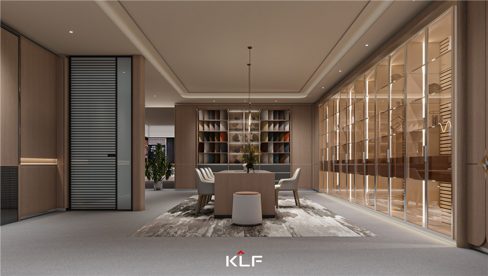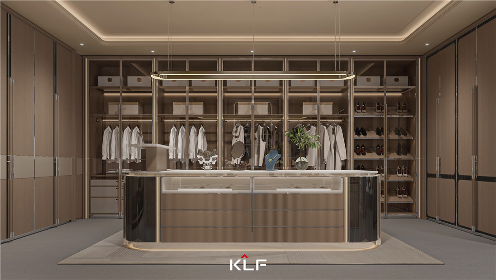 顏色上以白橡小山木紋搭配玻璃來呈現(xiàn)出輕奢,氛圍燈光渲染出柔暈光線,增加層次感;獨特的“F”品牌標(biāo)簽拉手,寓意“福”;掛衣桿以KLF中的“K”為靈感,打造了一個具有品牌辨識度的蝴蝶掛衣桿。