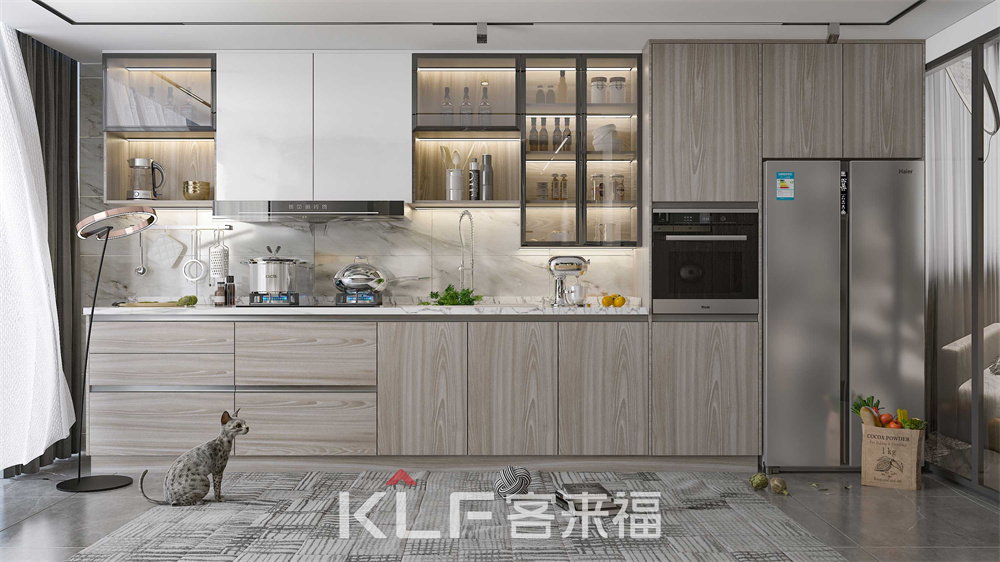 一字型排開構(gòu)造,動(dòng)線合理,素雅白+原木色搭配金屬元素和鋼化玻璃,打造溫馨舒適的空間環(huán)境,嵌入式冰箱和烤箱設(shè)計(jì),與櫥柜融為一體愈顯大氣、簡約。