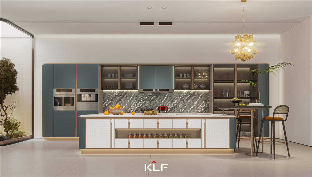 圓弧元素貫穿空間,線條顯溫柔之美。整面定制櫥柜以鳶尾藍(lán)為主色調(diào),羅馬柱、嵌入燈光的運(yùn)用,勾勒出高級(jí)奢感;島臺(tái)整體呈橢圓形,島臺(tái)柜門采用客來福IP皮革雕刻工藝,顏值在線;珊瑚白柜門與魚肚白臺(tái)面相呼應(yīng),顏色更具層次感。