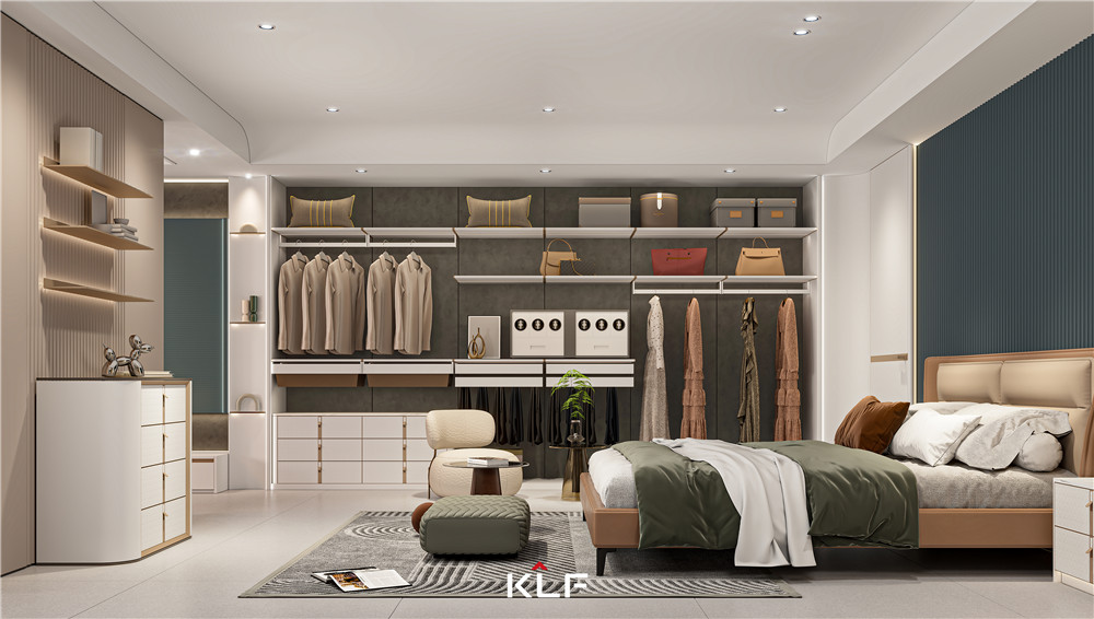 臥室背景板應(yīng)用了極光白的S弧形護(hù)墻板+菱形格+圓弧波浪板,凹凸有致,以光影感成就空間藝術(shù)感;床頭柜沿用IP雕刻門板+兩側(cè)圓弧設(shè)計(jì),讓小床頭柜也頗具特色;衣柜采用懸掛系統(tǒng),整體敞開式布局增強(qiáng)空間通透感。