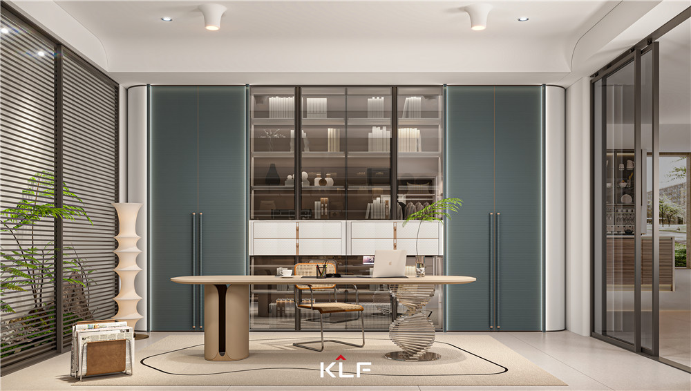 書房?jī)蓚?cè)帶燈裝飾柱+極光白圓弧墻板,以侘寂奢感展現(xiàn)空間韻味,門板上的特色拉手讓人驚艷。