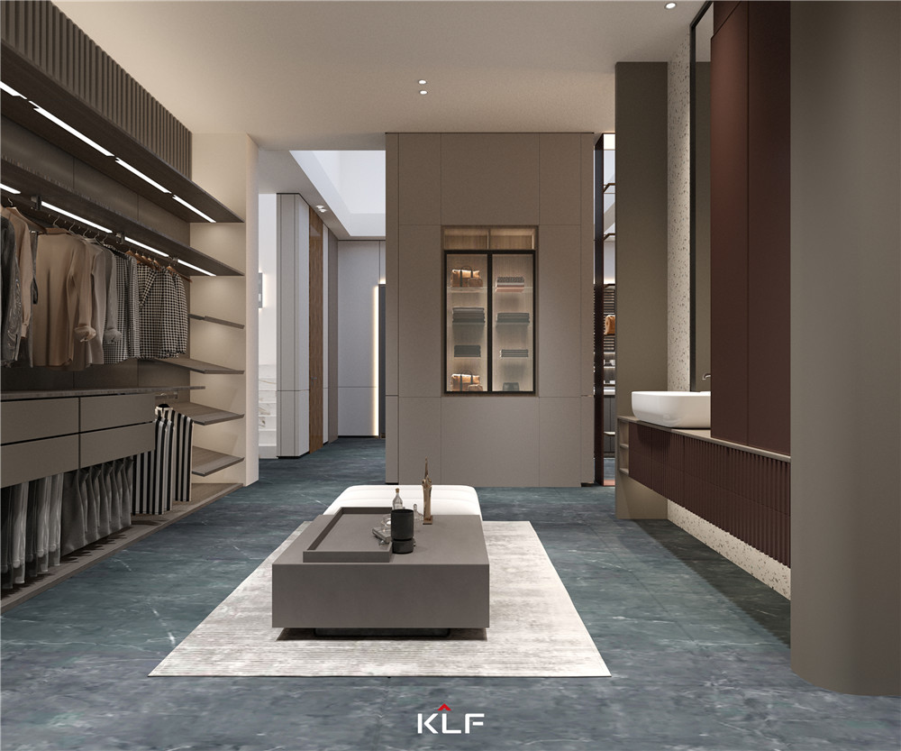 衣帽間采用淺可可同色水漆柜門及墻板,以不同材質間的碰撞實現(xiàn)真正定制!客來福全壁掛式結構的運用,讓衣帽間具有奢華感,分功能收納更省心。