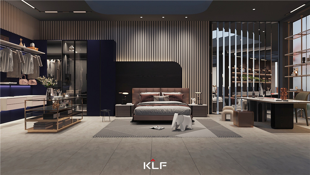 壁掛式衣帽間,使得衣物收納明晰,也方便家庭成員找尋;臥室背景墻采用格柵設(shè)計搭配圓弧護墻,傳遞出中式之雅韻;書房采用金屬架+木色套格設(shè)計,展現(xiàn)時尚感與溫潤感。